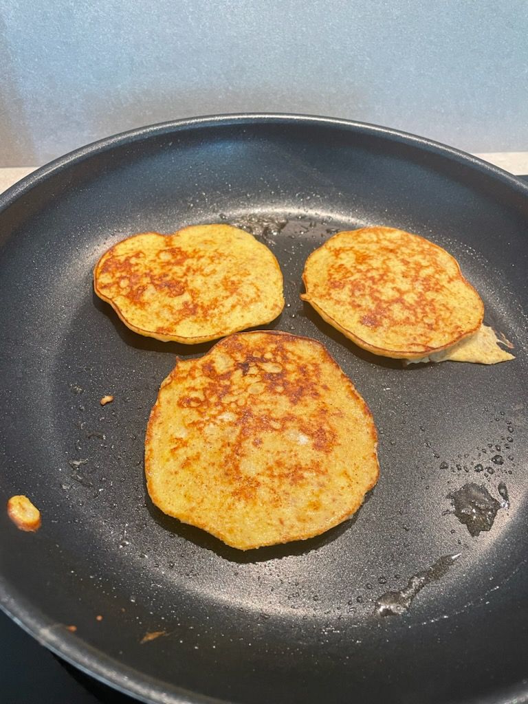 - Scoop into small circles onto a greased pan on medium heat, flipping when golden brown (about 2 minutes).